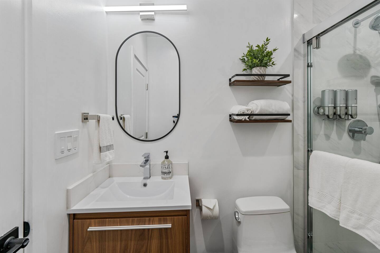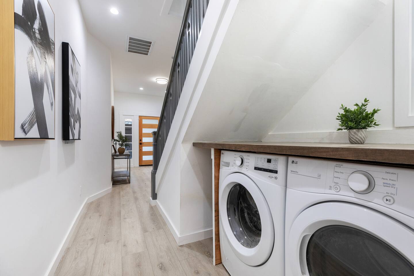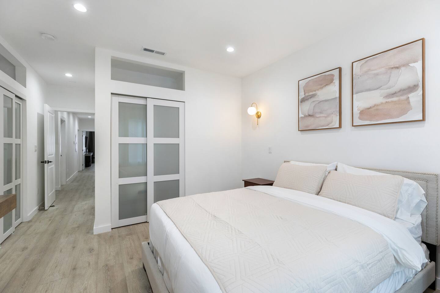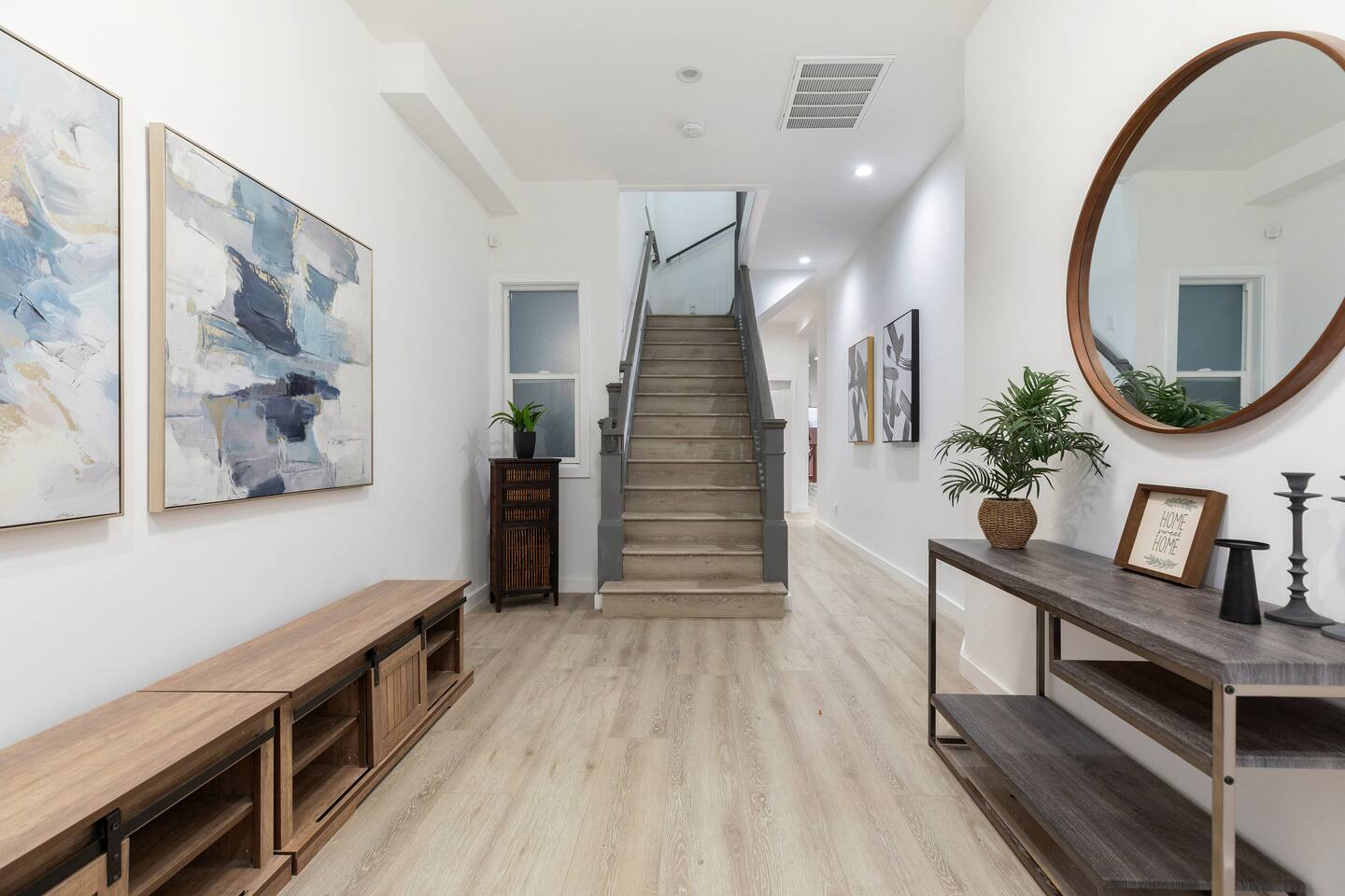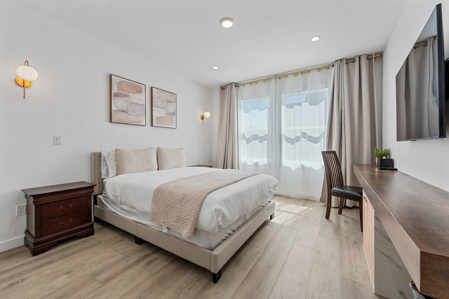 Welcome to our newly renovated oasis! Experience the epitome of modern comfort in this beautifully remodeled home. All four bedrooms are ENSUITES! You can enjoy having your own private bathroom. All bathrooms are full baths. Guests who likes some extra space to relax can enjoy our room with a KING size bed. Complimentary Paramount Plus, Disney Plus, Hulu and ESPN TV streaming service for you to enjoy. Used limited by availability. Up to 3 devices can be used at the same time except for Hulu. One of the bedrooms is conveniently located on the first floor, offering easy access without stairs. Perfect for guests who prefer ground-level accommodation! Indulge in the luxuries of our rain showers and revel in the spacious, open-concept design that seamlessly connects the living room, dining room, and a chef's dream kitchen with state-of-the-art appliances. When you step outside through the patio doors, you'll be greeted by a backyard adorned with enchanting string lights and lush greenery, creating a perfect haven for relaxation. Forget about the hassle of laundry as we offer convenient on-site washer and dryer facilities, along with the added bonus of a private one-car garage for your convenience. If you're here for work or business, we've got you covered with high speed internet and a dedicated workspace, ensuring productivity in a peaceful environment. Each bedroom includes its own smart HDTV. As the day turns into night, head up to our rooftop paradise, complete with a BBQ grill ready for unforgettable gatherings. Enjoy your meals under the stars with ample seating for friends and family, all while taking in the breathtaking city view. But the fun doesn't end there! Adjacent to the BBQ area, we've crafted a movie and game room to elevate your stay. Immerse yourself in cinematic experiences on our impressive 135-inch projector screen while relishing the nostalgia of fresh popcorn from our vintage machine. Challenge your friends and family to thrilling games of foosball, or engage in lively board games that will keep you laughing for hours! Guest access Guests have access to the whole house, including on-site laundry, attached garage, backyard, and roof. *The host is occupying one of the rooms on the second floor and you may or may not see the host on a daily basis.